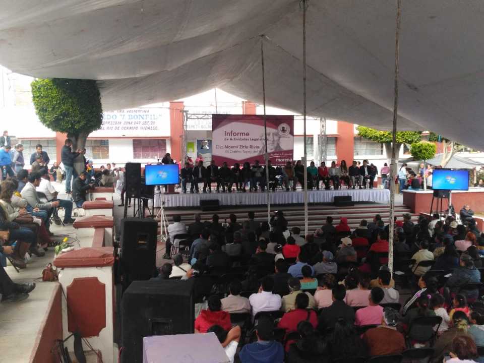 Atotonilco de Tula, Hidalgo.- La diputada local por el XV distrito, Noemí Zitle Rivas, presentó su informe legislativo en la Alcaldía de Atotonilco de Tula y en la explanada de la Presidencia Municipal de Tepeji del Río. Mencionó que entre los resultados de este primer periodo de sesiones que comprenden de Septiembre a Diciembre, se logró el redireccionamiento del presupuesto, y que con esto se beneficia directamente a los municipios, etiquetando 4 millones 800 mil pesos para Atotonilco de Tula, favoreciendo en esta ocasión a las comunidades de San José Acococulco, Progreso y El Portal.