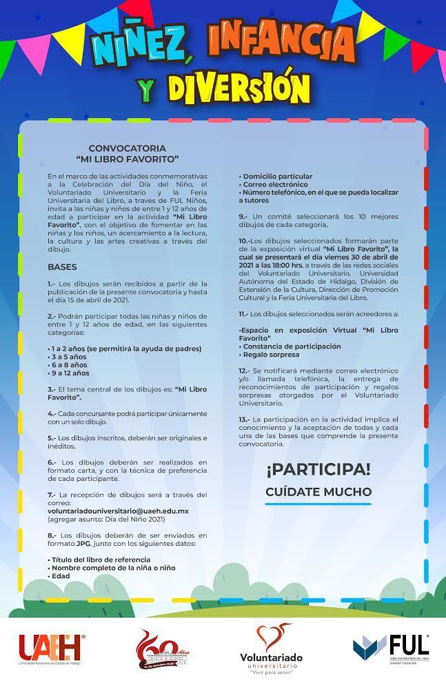 Pachuca de Soto, Hidalgo. – En el marco de las actividades conmemorativas a la celebración del Día del Niño, el Voluntariado de la Universidad Autónoma del Estado de Hidalgo (UAEH) y la Feria Universitaria del Libro (FUL) invitan a los más pequeños del hogar de entre uno y doce años de edad a participar en la actividad “Mi libro favorito”.