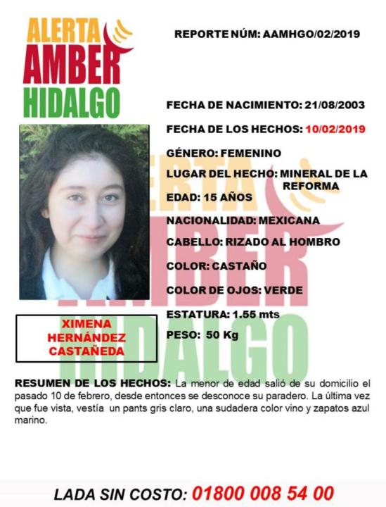 Mineral de la Reforma, Hidalgo.- Solicitamos su colaboración para la difusión de la presente Alerta AMBER Hidalgo, en favor de la menor de edad XIMENA HERNÁNDEZ CASTAÑEDA, a quien se le vio por última vez en Mineral de la Reforma, Hidalgo.
