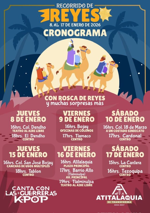 Atitalaquia.- Del 8 al 17 de enero de 2026, los Reyes Magos recorrerán Atitalaquia llevando alegría, convivencia y tradición a niñas, niños y familias del municipio, con la tradicional Rosca de Reyes, espectáculos y muchas sorpresas.